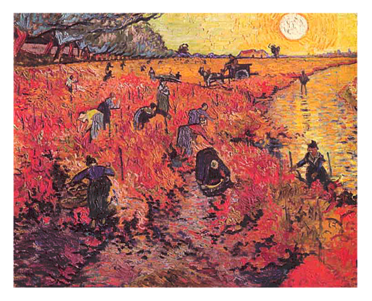 Vincent van Gogh, writing to his brother Theo, November 3, 1888: “But if only you’d been with us on Sunday! We saw a red vineyard, completely red like red wine. In the distance it became yellow, and then a green sky with a sun, fields violet and sparkling yellow here and there after the rain in which the setting sun was reflected.”